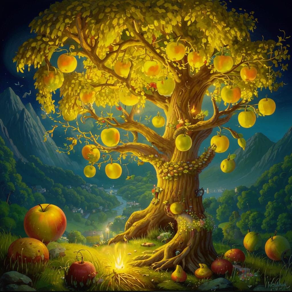 Подойдя к дереву, Иван коснулся его ствола. Древо ожило, ветви зашептали, листья зашелестели, а золотые яблоки засияли ещё ярче, освещая всё вокруг своим мягким светом.
