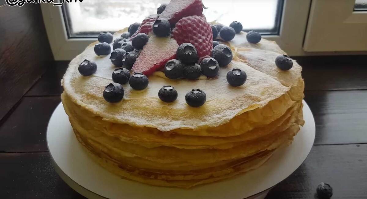 На первый блин нанесите крем по плотной спирали, затем накройте следующим блином. Повторяйте процесс, чередуя блины и крем. - Пропитка: Уберите торт в холодильник на ночь, чтобы он хорошо пропитался и стал более нежным.