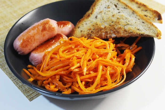 Обожаю морковь по-корейски. Добавляю её куда только можно - в шаурму, сэндвичи, хот-доги и конечно же в салаты. Да и просто так, с хлебушком, эта закуска вполне неплохо заходит. Раньше покупал её на развес, в небольшом магазинчике у дома. Покупал до тех пор, пока не обнаружил в пакете парочку жирных тараканов. С тех пор как отрезало, смотреть на магазинную морковь больше не могу. Пришлось учится готовить любимую закуску самому. Перепробовал несколько разных рецептов, в итоге остановился на представленном ниже. В нем меня устраивает все - вкус, уровень остроты, простота приготовления. На один килограмм очищенной моркови потребуется: 100 мл растительного масла 1 средняя головка чеснока 3 ст. ложки 9% уксуса 2 ст. ложки сахара 1 ч. ложка соли 1 ч. ложка паприки 0, 5 ч. ложки острого красного перца 0, 5 ч. ложки черного молотого перца 0, 5 ч. ложки молотого кориандра. Морковь промыть, очистить и натереть тонкой соломкой на терке-мандолине. 2. Очищенный чеснок измельчить любым удобным спосо