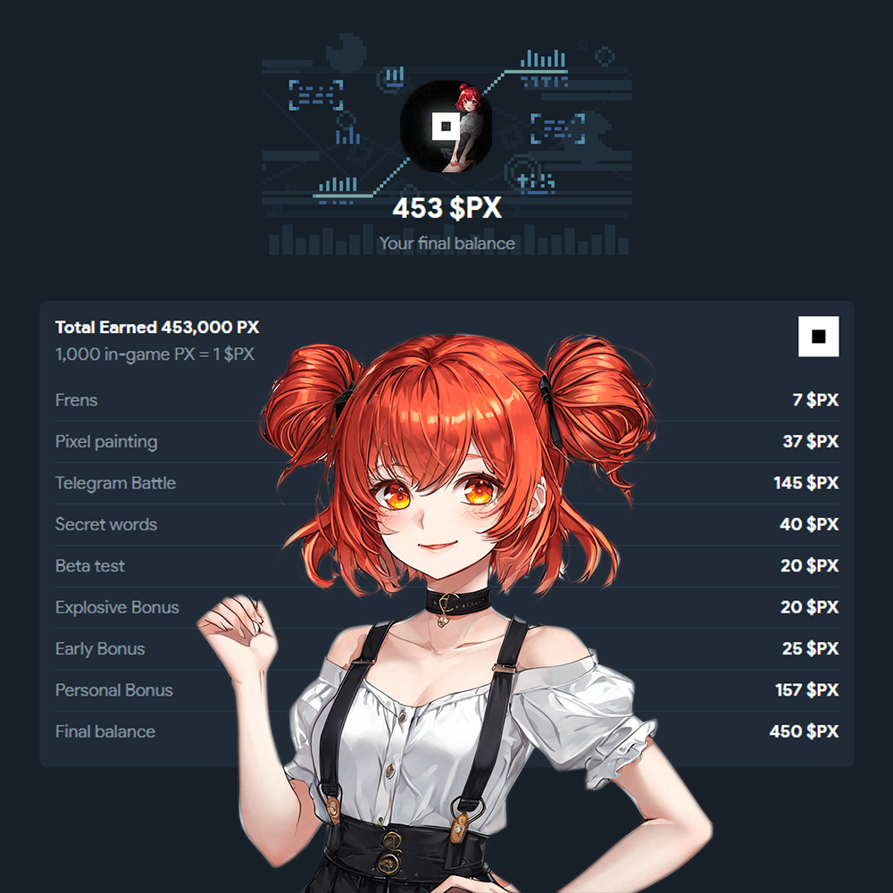 в Not Pixel. 🥹 Внесём немного ясности (возможны неточности, пост будет редактироваться) Frens - Ваши друзья, их кол-во и активность; Pixel Painting - Ваше участие в кол-ве закрасов на поле; Telegram Battle - Участие в турнирах и награда за них; Secret Words - Участие в поиске и вводе секретных кодов; Beta Test - Участие в проекте на момент Бета-Теста; Explosive Bonus - Бонус за использование динамитов (за какое кол-во мы не знаем); Early Bonus - Бонус за ... (не знаем что это такое); Personal Bonus - Это ваш баланс пикселей без учёта трёх нулей, который вы заработали до стопа фарминга; Final Balanсe - Ваш финальный баланс.