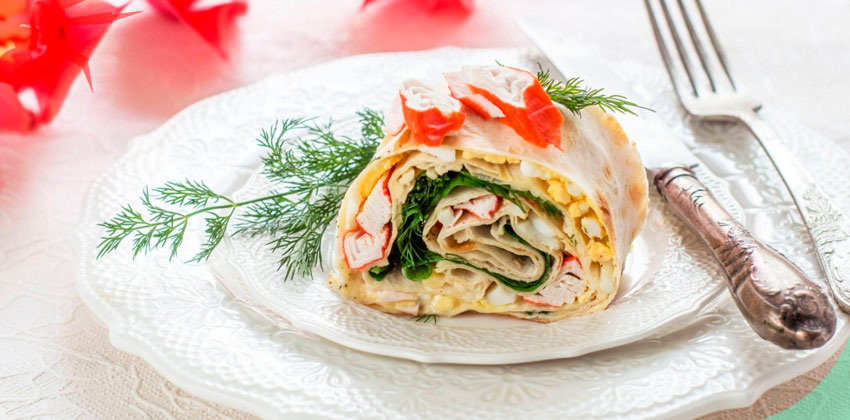 Смазываем лист лаваша сметаной. Распределяем по ней подготовленные ингредиенты. Сворачиваем лаваш в рулет. Убираем в холодильник минимум на 1 час, чтобы он пропитался. Перед подачей нарезаем. Блюдо готово. Приятного аппетита!