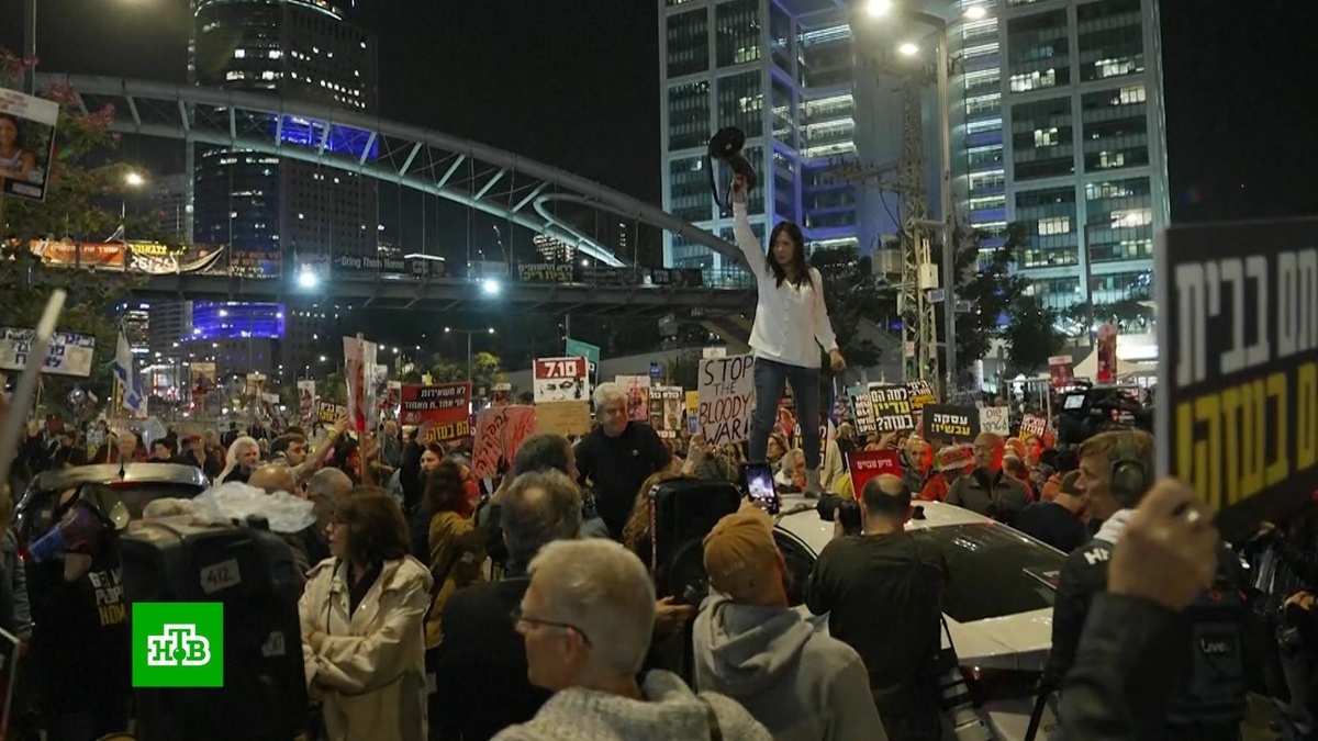 [ Смотреть видео на сайте НТВ ] Кадры прямой трансляции с камер, которые установлены в центре Тель-Авива, где уже почти сутки проходит стихийный митинг. В Тель-Авиве уже около суток длится масштабный стихийный митинг, связанный с попыткой договориться с ХАМАС о перемирии и возвращении заложников из сектора Газа. Пока речь идет именно попытке, поскольку сделка с ХАМАС, широко анонсированная накануне, не только не вступила в силу, но и вообще может быть сорвана. Против перемирия активно выступает часть правительства Израиля. Там заявляют, что страна платит слишком большую цену за то, чтобы вывести войска из Газы. Такие новости заставляют родственников и друзей заложников фактически жить на улице с плакатами и свечами в руках. Виден большой плакат с обращением к Дональду Трампу с просьбой освободить захваченных в плен израильтян. На асфальте горящими свечами выложили надпись Оne deal for all — «одна сделка для всех». Участники митинга в Тель-Авиве не зря апеллируют не к властям своей стра