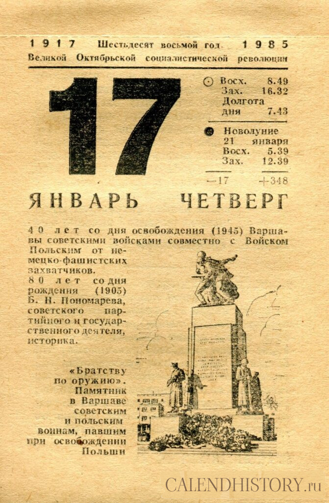 Итак, сегодня 17-го января и у нас на календаре 1985-й год. Перед нами листок советского календаря для женщин. На календаре у нас четверг - 17 января 1985-го года. 40 лет со дня освобождения (1945) Варшавы советскими войсками совместно с войском Польским от немецко-фашистских захватчиков. 80 лет со дня рождения (1905) Б. Н. Пономарева, советского партийного и государственного деятеля, историка. «Братству по оружию». Памятник