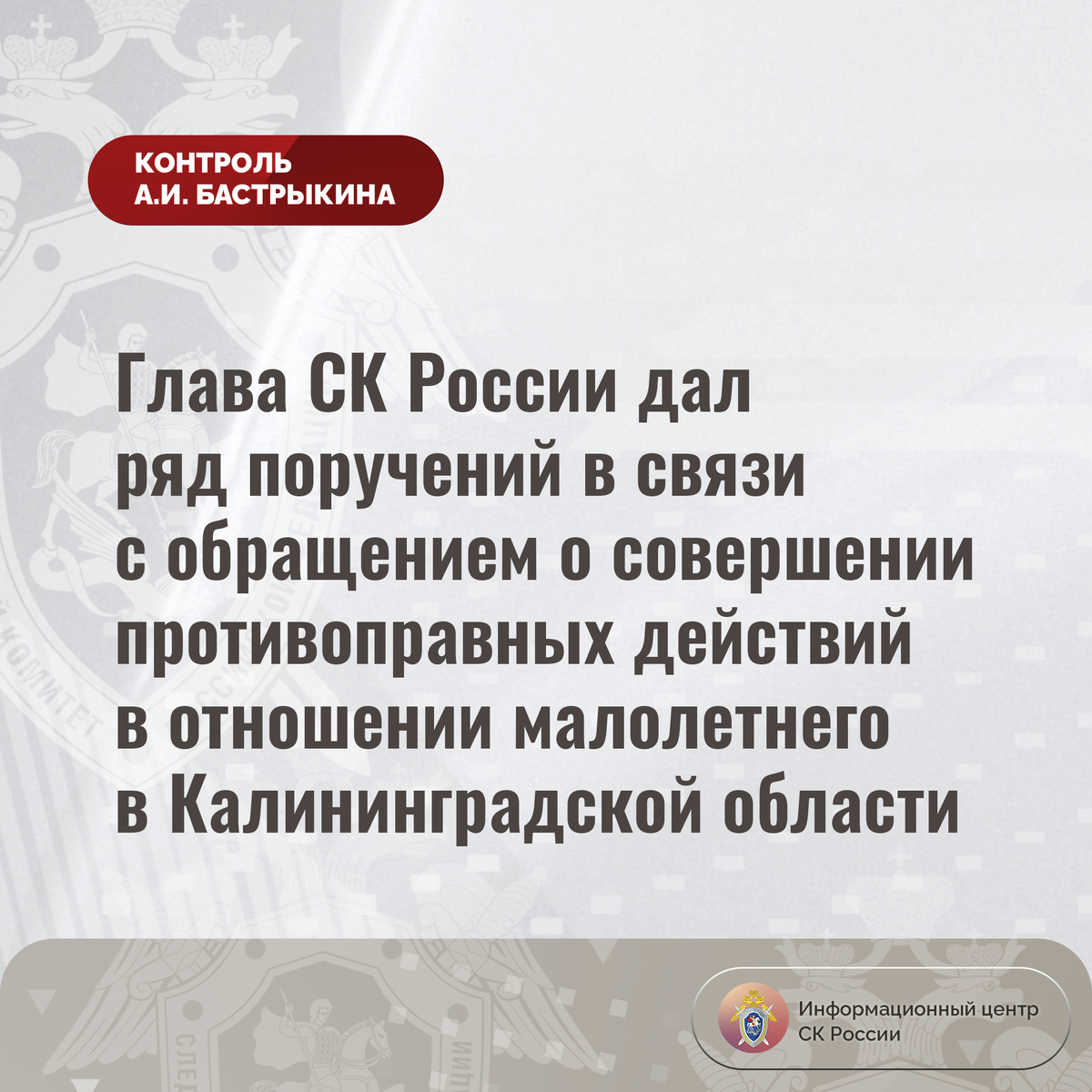 Глава СК России дал ряд поручений в связи с обращением о совершении противоправных действий в отношении малолетнего в Калининградской области В комментариях приёмной Председателя СК России А.И. Бастрыкина «ВКонтакте» поступило обращение о несогласии с ходом установления обстоятельств совершения посягательства против половой неприкосновенности ребенка-инвалида в одной из школ-интернатов в Калининградской области. Заявительница указывает на неполноту расследования. До настоящего времени никто к ответственности не привлечен. Ранее указанная ситуация освещалась в сети Интернет. В СУ СК России по Калининградской области уголовное дело, возбужденное по поручению А.И. Бастрыкина, было прекращено. В настоящее время данное решение отменено, расследование возобновлено. Председатель Следственного комитета Российской Федерации Александр Иванович Бастрыкин поручил Главному следственному управлению СК России провести проверку по факту допущенной в СУ СК России по Калининградской области волокиты по