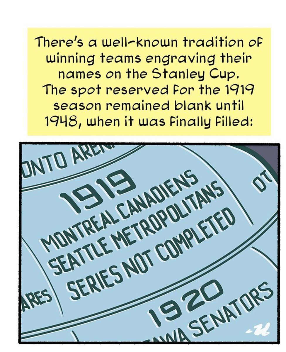 Это, так сказать, фон, на котором разыгрывалась трагедия. Трагедия, о которой всегда будет напоминать гравировка на несъёмной части Кубка Стэнли. Серия, как вы знаете, так и не была доиграна. Следующий матч между «Сиэтлом» и «Монреалем» состоялся уже в «наше время», 26 октября 2021 года, и закончился победой «Сиэтла» – 5:1.