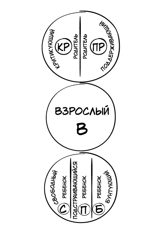 Нижний — наш внутренний Ребенок. В зависимости от ситуации он предстает свободным ребенком, или подстраивающимся, или бунтующим. Свободный ребенок — играющая креативная личность, из которой мы черпаем вдохновение и новые идеи. Подстраивающийся — послушный ребенок, покорно делающий то, что говорит ему внутренний Взрослый или кто-то снаружи. А основная цель бунтующего ребенка — нарушить запрет вне зависимости от того, насколько это полезно для него самого.