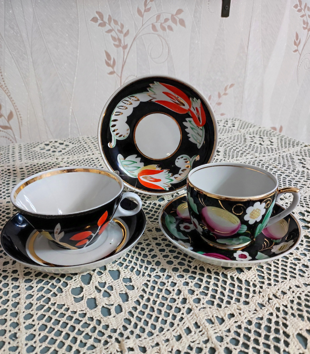 Ещё одна чайная пара - "Листья и веточки" или "Веточки" на чёрном крытье.