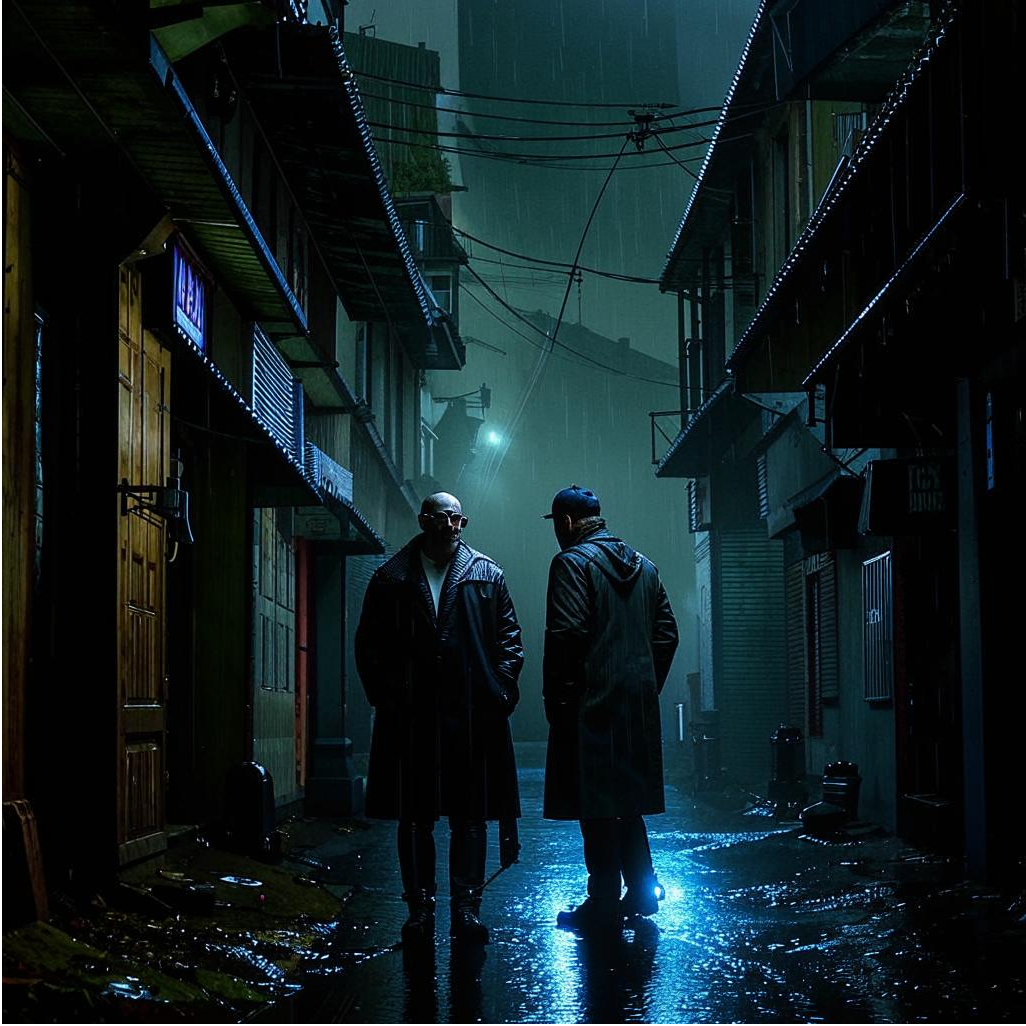 Ночь окутала город, как черное покрывало, и лишь редкие огни фонарей пробивались сквозь мелкий, моросящий дождь. В переулке, где даже тени казались зловещими, стояли двое мужчин. Они молча курили, нервно поглядывая на пустую улицу.
