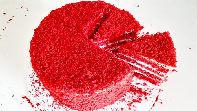 Готовлю классический американский торт Красный Бархат, который пользуется популярностью не только в США, но и во всём мире. Торт по оригинальному и чётко отработанному рецепту получается с пышными и очень пористыми бисквитами, которые сами по себе очень вкусные и влажные. Тесто: Крем: Прослойка: По данному рецепту сливочное масло должно быть мягкое. Если сливочное масло из холодильника, разогрейте его в микроволновой печи и оно готово к работе. Кефир должен быть не холодный. Если кефир из холодильника, разогрейте его в микроволновой печи до тёплой температуры. В чашу с яйцами всыпаю сахар. Перемешиваю миксером на высоких оборотах, до пышной светлой массы в течение 2 минут. Вливаю кефир и гелевый пищевой краситель красного цвета. Перемешиваю недолго миксером на низких оборотах. Добавляю размягченное сливочное масло и растительное масло. Перемешиваю недолго миксером на низких оборотах. Через сито просеиваю всю муку. Затем просеиваю какао порошок. Добавляю: соду, ванилин, разрыхлитель и с