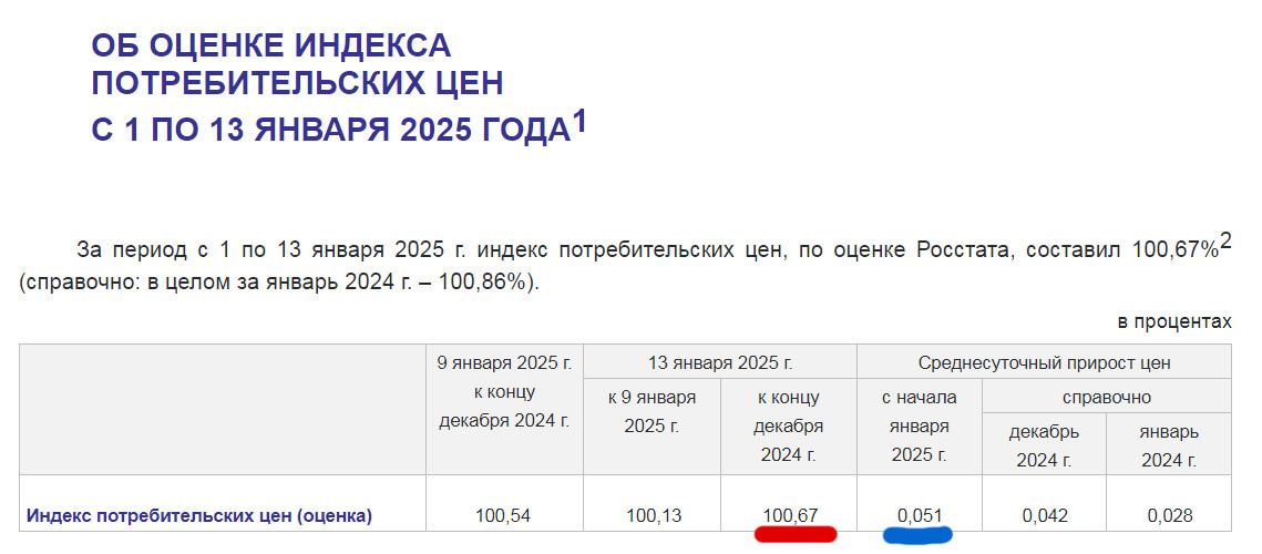 Это видно по резкому инфляционному старту первых двух недель 2025 года, показавшему рост в 0,67% (или 0,051% в сутки) с начала года: