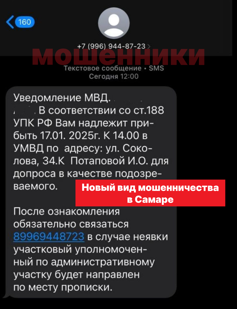 О новом способе мошенничества, который распространяется в регионе, рассказал у себя на странице заместитель председателя Совета депутатов Октябрьского внутригородского района г. о. Самара, депутат КПРФ Дмитрий Асеев. Злоумышленники отправляют SMS-сообщения, в которых указывается ФИО владельца номера телефона и информация о вызове на допрос в качестве «подозреваемого» в «УМВД». В сообщении говорится, что необходимо срочно созвониться по указанному номеру. А в случае неявки к вам по месту прописки лично будет направлен участковый. Мошенники также просят подтвердить получение уведомления о вызове, после чего приходит SMS с доступом к госуслугам, что может привести к дальнейшим неприятным последствиям. «Естественно, обычный житель не заметит, что допрос может быть только в рамках уже возбужденного уголовного дела. А о возбуждении уголовного дела должны уведомить под роспись. Отдельно стоит проверить номер, с которого приходят сообщения. Например, данный номер зарегистрирован оператором YOT