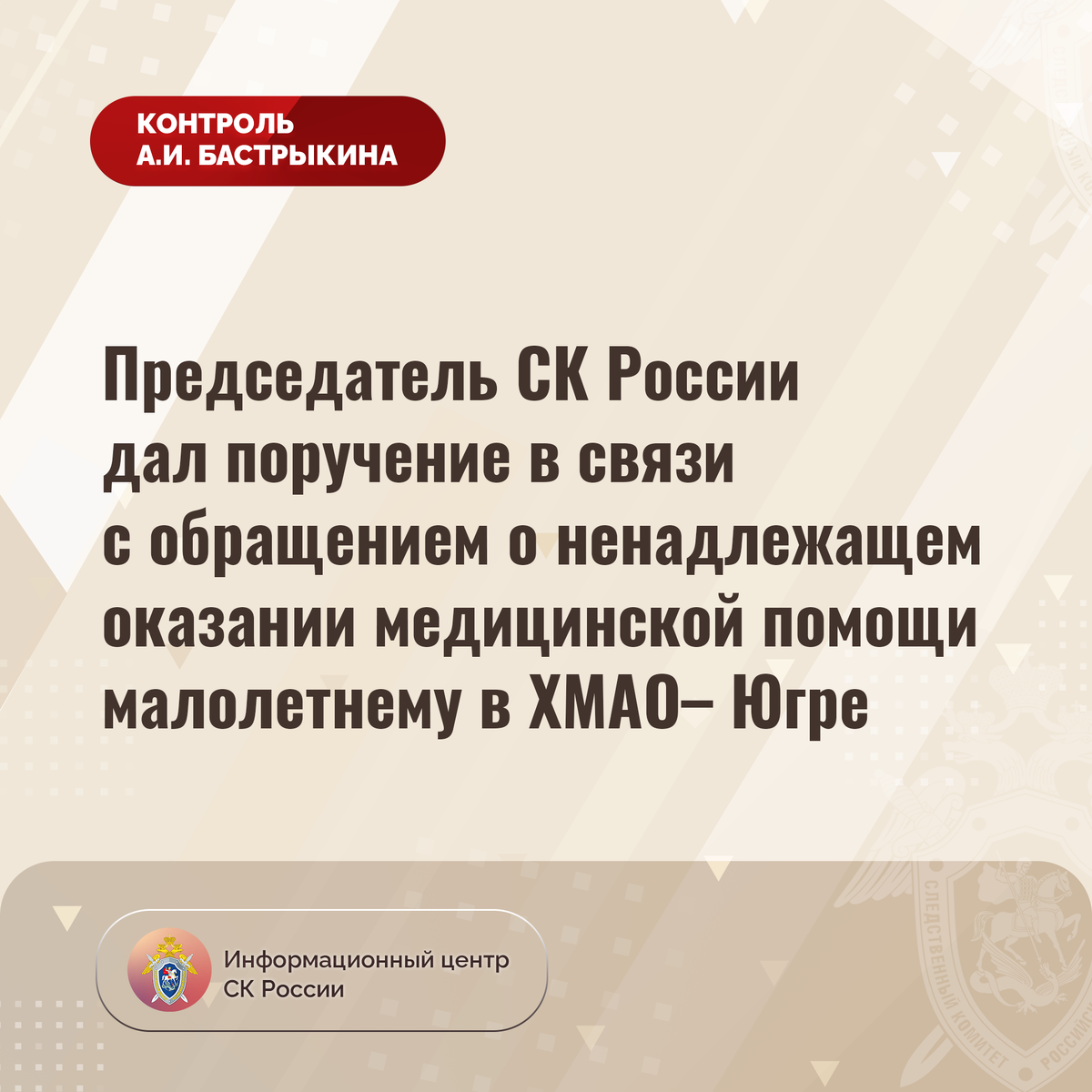 Председатель СК России дал поручение в связи с обращением о ненадлежащем оказании медицинской помощи малолетнему в Ханты-Мансийском автономном округе – Югре Жительница Ханты-Мансийского автономного округа – Югры в комментариях в аккаунте приемной Председателя СК России А.И. Бастрыкина «ВКонтакте» выразила несогласие с ходом установления обстоятельств смерти ее полуторагодовалого сына в результате ненадлежащего оказания ему медицинской помощи. В феврале 2023 года фельдшеры бригады скорой помощи и в последующем педиатр своевременно не диагностировали у ребенка пневмонию, через некоторое время он скончался. До настоящего времени виновные к ответственности не привлечены, расследование приняло затяжной характер. Заявительница указывает на длительность срока проведения комиссионной судебно-медицинской экспертизы. Ранее А.И. Бастрыкин поручал представить доклад по указанной ситуации. В СУ СК России по Ханты-Мансийскому автономному округу – Югре по данному факту расследуется уголовное дело, в