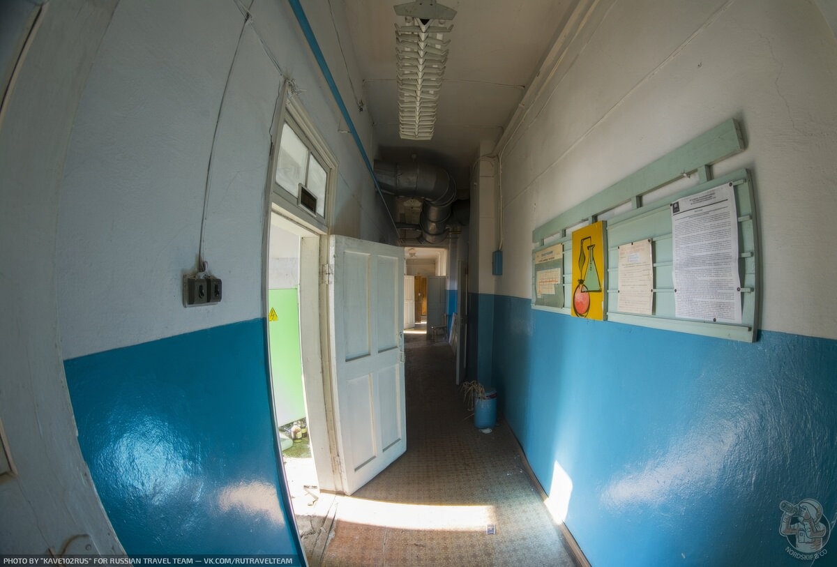 Классическая голубая краска на стенах, пожелтевшие объявления, включатели старого образца — всё это напоминает о советских НИИ, где тишина нарушалась только шелестом бумаг и звуком капель, падающих в мензурки.