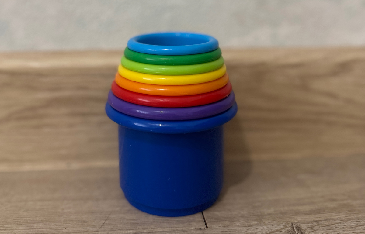- Пирамидка стаканчики. Она у нас где то с 6 месяцев и до сих пор актуальна. Сава уже сам составляет башню по цветам, а вообще он с ними придумывает себе много разных игр.