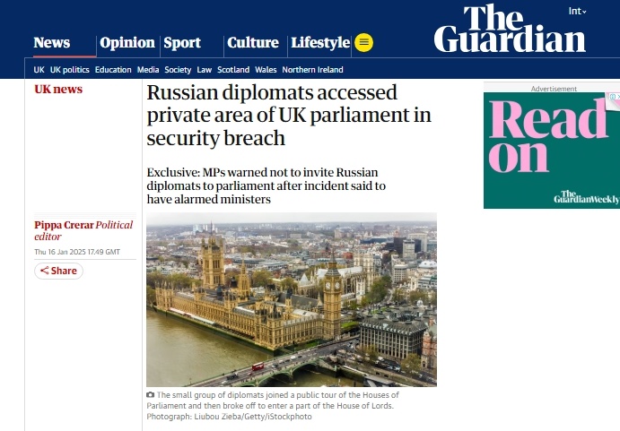 Потрясающий пример чисто английского гостеприимства приводит на своих страницах The Guardian: из британского парламента выгнали присоединившихся к экскурсии российских дипломатов. Как следует из публикации, инцидент произошел еше в конце прошлого года, накануне Рождества. Тогда российские дипломаты якобы «проникли закрытую зону парламента Великобритании, притворившись участниками экскурсии». «Несколько российских дипломатов пришли на публичную экскурсию по зданию парламента в Лондоне и в какой-то момент отделились от общей группы, зайдя в закрытое для посещений помещение Палаты лордов, откуда их выгнала охрана», – пишет газета. «Мы подозреваем, что они просто хотели похвастаться перед Кремлем, что проникли в британский парламент. Ситуация не идеальная, но их поймали до того, как был нанесен какой-либо ущерб», — утверждает конфидент The Guardian в британском парламенте. По его словам, произошедшее встревожило министров правительства и сотрудников службы безопасности, а депутатам и пэра