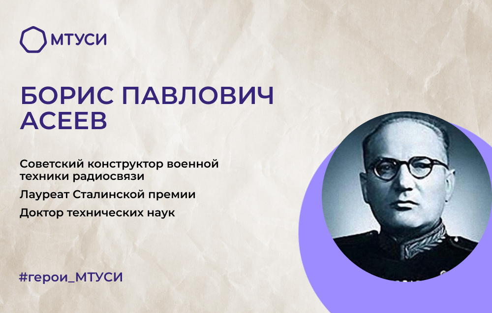 Борис Павлович Асеев — советский конструктор военной техники радиосвязи, доктор технических наук, профессор Московского электротехнического института связи (ныне МТУСИ), генерал-майор инженерно-технической службы, лауреат Сталинской премии l-й степени, родился 20 ноября 1901 г. в Рязани в семье мелкопоместного дворянина.