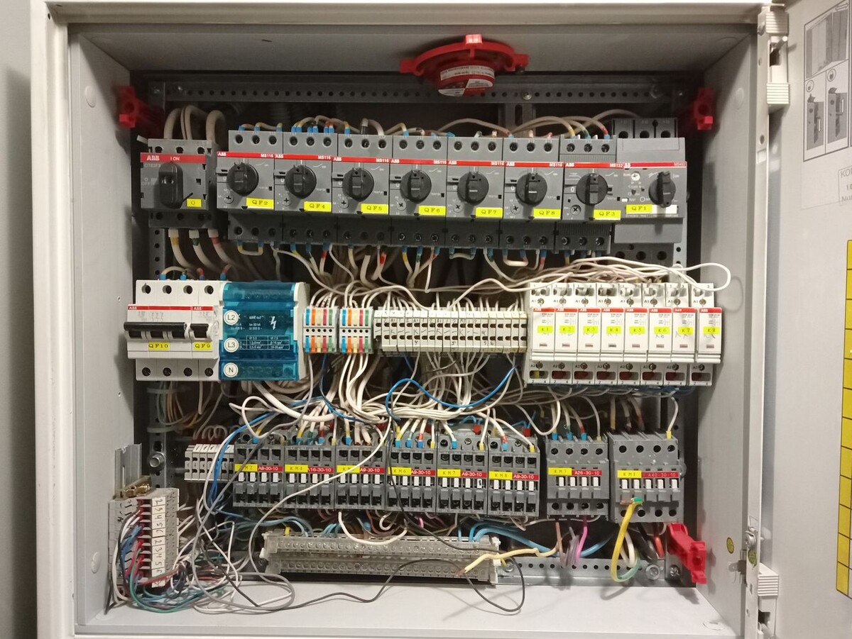 Нормальные люди сидят и не парятся когда всё работает, но видимо нормальность прошла мимо меня.) И так. Есть очередной щит, в котором стандартно меняются винтовые клеммы (на этой фотке уже начал), маркируются провода. Так же надо было поменять отходящие линии на питание частотный преобразователей. Разводка изначально была выполнена как-то чмошно. Особенно "порадовал" клеммник в нижнем левом углу. Вот он крупным планом. Как его подключали слабо представляю. Ещё и шины PE и N мешались. Почему не взяли щит большего размера, где всё бы нормально влезло, непонятно. Видимо монтажники были мазохисты. Чтобы поместить все клеммы на одной дин-рейке, пришлось немного поколдовать. 3Р автомат заменил на 1Р. Наклеечки выровнял, чтобы красивее было.) Кросс-модуль уехал влево, освободив место для 2-х клемм. Так на мой взгляд намного красивше и функциональнее. Заместо штатной дин-рейки поставил пару шин, места сразу стало больше. Попытка промаркировать клеммы. С маркировкой получилась какая-то хрень.