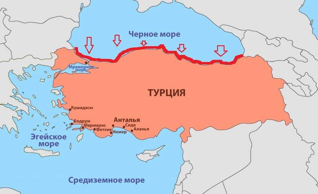 Протяженность береговой линии Турции на Черном море больше чем у России, но отдыхать и купаться туда особо никто не ездит. Ведь российские черноморские курорты, в летний сезон забиты до отказа. Россияне любят Черно море, но почему-то турецкое побережье не любит никто, да и сами турки, разумеется, отдыхают на Средиземноморье. 1) Во-первых, турецкое черноморское побережье очень извилистое, а берег скалистый. Именно по этой причине, на побережье Черного моря Турции очень мало отелей. Никто их не хочет там строить. 2) Скоростная автомагистраль, протянувшаяся вдоль черноморского побережья Турции. Кому захочется на отдыхе, слушать гул машин?! 3) Туристический сезон на Средиземном море длится фактически круглый год, а на Черном море он очень короткий. Поэтому прагматичным туркам, гораздо проще заработать на другом побережье. 4) На Севере Турции, а это как вы уже поняли черноморское побережье, живут турки со старыми традициями, они не такие радушные и гостеприимные, к тому же еще и английского