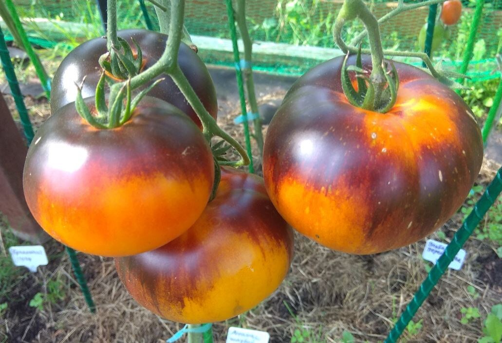 Очень красиво окрашенные огненные плоды, все испрещены полосками разных тонов и украшены богатым антоцианом. Мякоть также крепкая, не водянистая, по вкусу очень сбалансированная. В салатах при нарезке хорошо держит форму. Ну согласитесь, такую красоту - да на выставку.