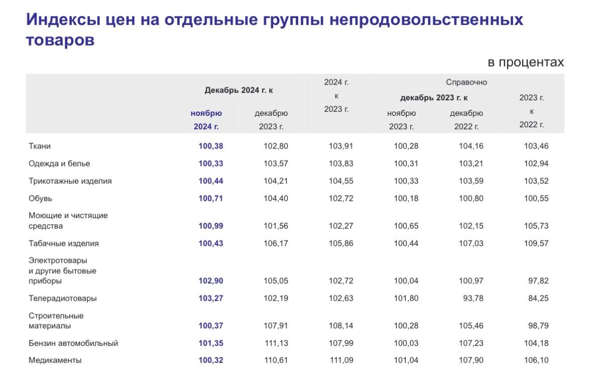 По данным ведомства, в декабре стоимость продовольствия в России увеличилась на 2,6% по сравнению с предыдущим месяцем и на 11,05% по сравнению с декабрем прошлого года. Индекс потребительских цен в декабре 2024 года по сравнению с ноябрем 2024 года составил 101,32%, по сравнению с декабрем 2023 года — 109,52%. Стоимость услуг увеличилась на 0,2% по сравнению с ноябрем 2024 года и на 11,52% по сравнению с декабрем прошлого года. Таким образом, инфляция по итогам года оказалась выше ожиданий Банка России и Минэкономразвития. Ранее министерство ожидало ее на уровне в 7,3%, а ЦБ РФ. в свою очередь, прогнозировал инфляцию в диапазоне 8-8,5%.