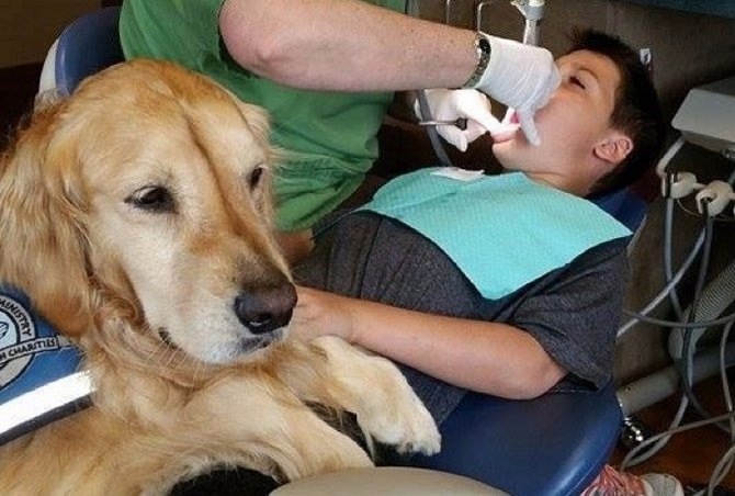 Так, например, в стоматологической клинике Нортбрука (США) в детском кабинете работает золотистый ретривер по кличке Джо-Джо. Он помогает маленьким пациентам почувствовать себя спокойно и уверенно во время такой неприятной процедуры, как лечение зубов. Стоматолог, работающий в паре с четвероногим, уверяет, что, когда дети держат пса за лапу, они мгновенно успокаиваются, а лечение зубов проходит заметно легче.