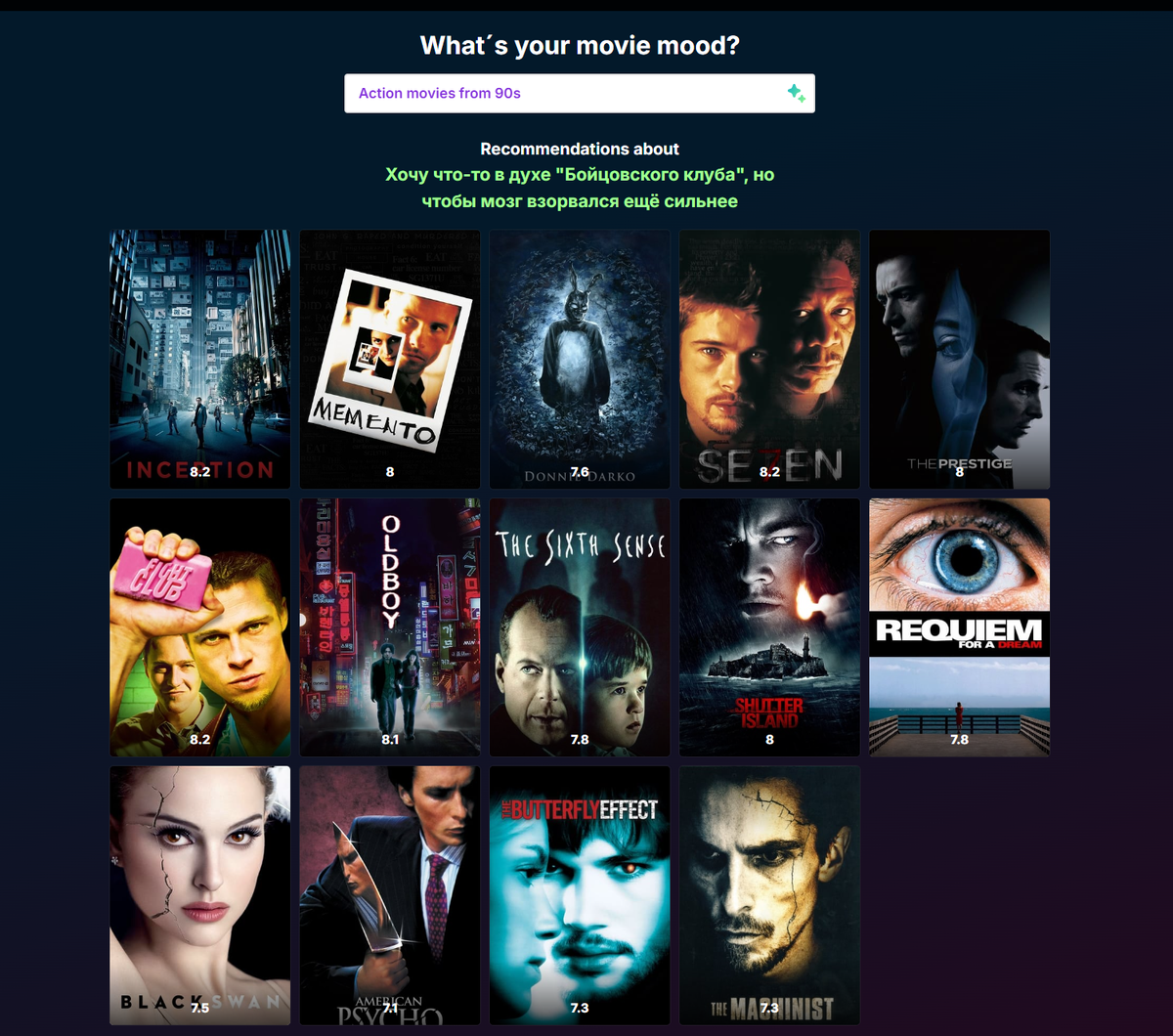 Мой запрос был таким: «Хочу что-то в духе "Бойцовского клуба", но чтобы мозг взорвался ещё сильнее». И знаете, что? Первый же фильм из подборки оказался прям в точку! Я бы никогда не нашёл его сам.