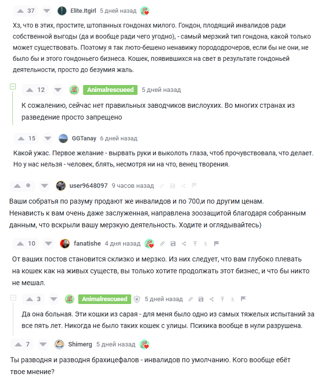 Я заводчик британских кошек-шиншилл с 2005 года. В свете последних событий (участия в одной из дискуссий на Пикабу по поводу серии статей Зоозащитники vs размноженцы на Дзене) у меня возникло стойкое ощущение, что если зоозащитников тут в избытке, то с заводчиками как-то не очень. То ли они совсем в загоне, так что их не слышно и не видно, то ли это в принципе ресурс исключительно для зоозащиты и заводчикам сюда хода нет. В мой адрес и в адрес моих совладельцев (людей, которых здесь толком никто не знает, чьих кошек никто не видел и не в курсе, как они содержатся) по указке местного завсегдатая Animalrescueed, зоозащитницы, порядка 6 лет назад организовавшей частный приют в своем доме в СНТ, были вывалены сразу тонны подобных высказываний: