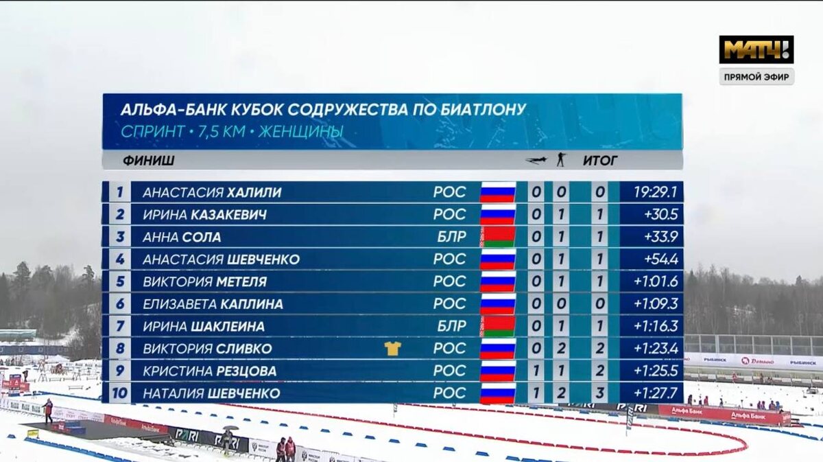 Анастасия Халили победила в спринте на этапе Кубка Содружества в Демино. 🥇Анастасия Халили – 19:29.1 (0) 🇷🇺 🥈 Ирина Казакевич +30.4 (1) 🇷🇺 🥉 Анна Сола +33.9 (1) 🇧🇾 Настя отстреляла на ноль! Это событие практически мирового масштаба. Ну ладно, хотя бы внутрироссийского. Редкость. Зато сразу же какая уверенная победа. Вот лыжники говорят, что чтоб выигрывать на Кубке мира, надо в России привозить всем минимум 30 секунд. Что ж, если бы это правило было применимо и к биатлону, то сегодня Халили пробежала по уровню лучших в мире. Хочется верить, что так оно и есть. Тем более, что сегодняшняя трасса и по уровню сложности, и по погоде соответствовала мировой. И как же жаль, что рядом с подиумом нет другой такой же талантливой молодой спортсменки Наталии Шевченко. Больно смотреть на то, как она сейчас выглядит. Не ее форма, не ее скорость. А Насте я от всей души желаю удержать показанный сегодня уровень стрельбы. Бежит-то она действительно круто. С подиумом Иру. Заслужила. Кто видел,