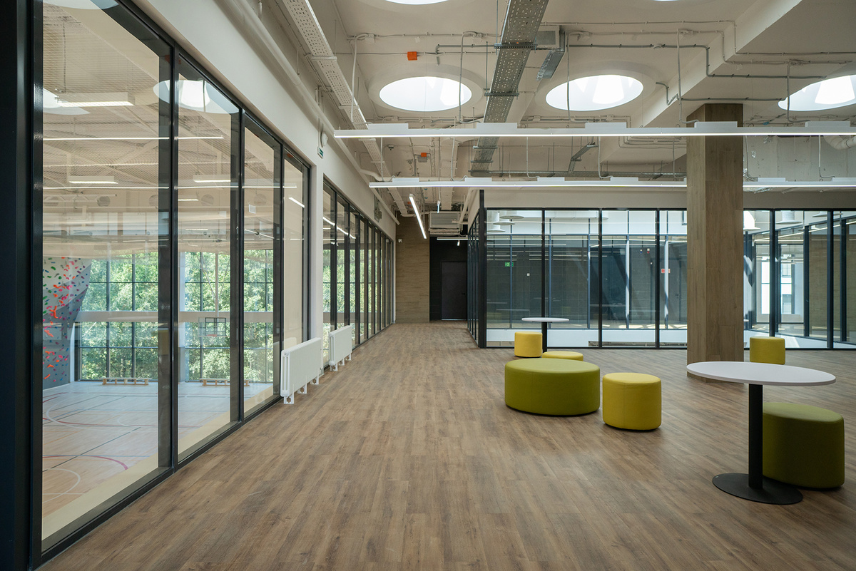 - Применили разный процент остекления перегородок между классами и рекреациями: где-то стена совершенно прозрачная, в другом месте в стекле выполнена только часть перегородки, а где-то перегородка наглухо закрывает тело класса.