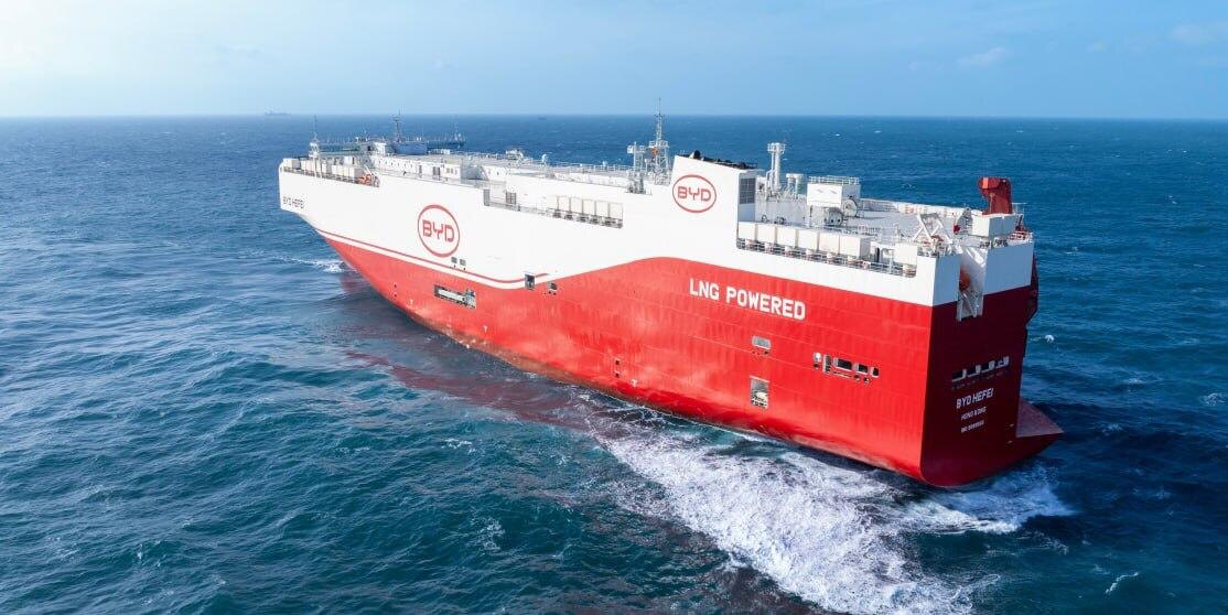Первое специализированное китайское судно для транспортировки новых легковых и грузовых автомобилей компании BYD вышло в дебютный рейс. Автомобилевоз оснащен двухтопливными двигателями, способными работать на сжиженном природном газе, и имеет вместимость 7000 CEU.