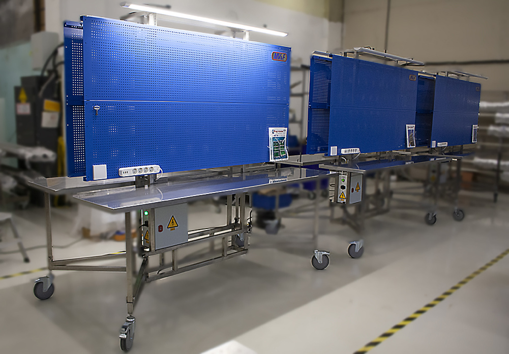 Мобильные лабораторные столы и стенды предназначены для проведения лабораторных работ и представляют собой рамную конструкцию с раздвижными опорами, имеющими ограничители крайних положений. Опоры оснащены колесами со стопорами для перемещения стенда. В составе имеются две откидные нержавеющие столешницы, предназначенные для размещения персональных компьютеров, ноутбуков и других принадлежностей, необходимых для проведения лабораторных работ. Вертикальные панели с перфорацией позволяют закреплять элементы пневматических, вакуумных, электрических и оптических систем.
