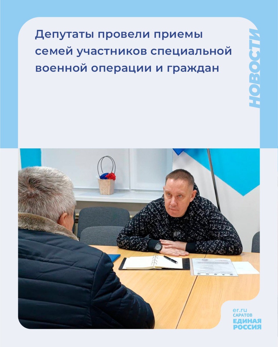 👥В Балашове на встрече с бойцами и их родными. Сергей Гладков обсудил вопросы, связанные с получением мер поддержки, юридической помощи и передачи гуманитарных грузов, а также реабилитацию вернувшихся с фронта военнослужащих. 💬«Важное место в этой системе занимает работа первичных отделений партии «Единая Россия», которая не только помогает бойцам на передовой и их близким в мирной жизни, но и создает условия для включения их в политическую деятельность, управленческую и патриотическую работу. О необходимости этого говорил на съезде «Единой России» Президент Владимир Путин», - рассказал Сергей Гладков. В Саратове к депутату Думы, Герою России Александру Янкловичу обратились жители, оказавшиеся в сложной жизненной ситуации. Парламентарий поддержал двух жительниц поселка Юбилейный, обратившихся к нему за материальной помощью. Еще одна заявительница попросила депутата оказать содействие в улучшении жилищных условий. Александр Янклович внимательно изучил её ситуацию и дал подробные