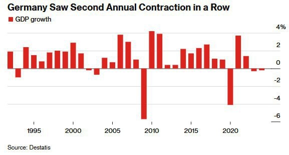 ВВП Германии снизился второй год подряд. По итогам 2024 года, согласно предварительной оценке, экономика ушла на минус 0,2% (в 2023 было минус 0,3%). В это же время ВВП России вырос на 3,6% в 2023 и примерно на 4% в 2024 году. Как и прогнозировалось ранее, практически полное прекращение российских энергоресурсов больно ударило по европейской экономке. Германия – самый яркий пример. Деиндустриализация также идет полным ходом. За последние три года немецкая промышленность уже сократилась на 7%. Помню, часто шли разговоры о том, что без российского газа Европа замерзнет. И такое повторялось каждый год. Но такие заявления делали откровенные популисты, занимающиеся самопиаром. Основной потребитель газа и других энергоресурсов – это не население, а промышленность. "Замерзнуть" европейцы не могли даже теоретически, поскольку для "обогрева" топлива нужно не так много, пусть и по более высокой стоимости. А вот что касается индустриальных отраслей, то здесь произошло ровно так, как и прогнозиров