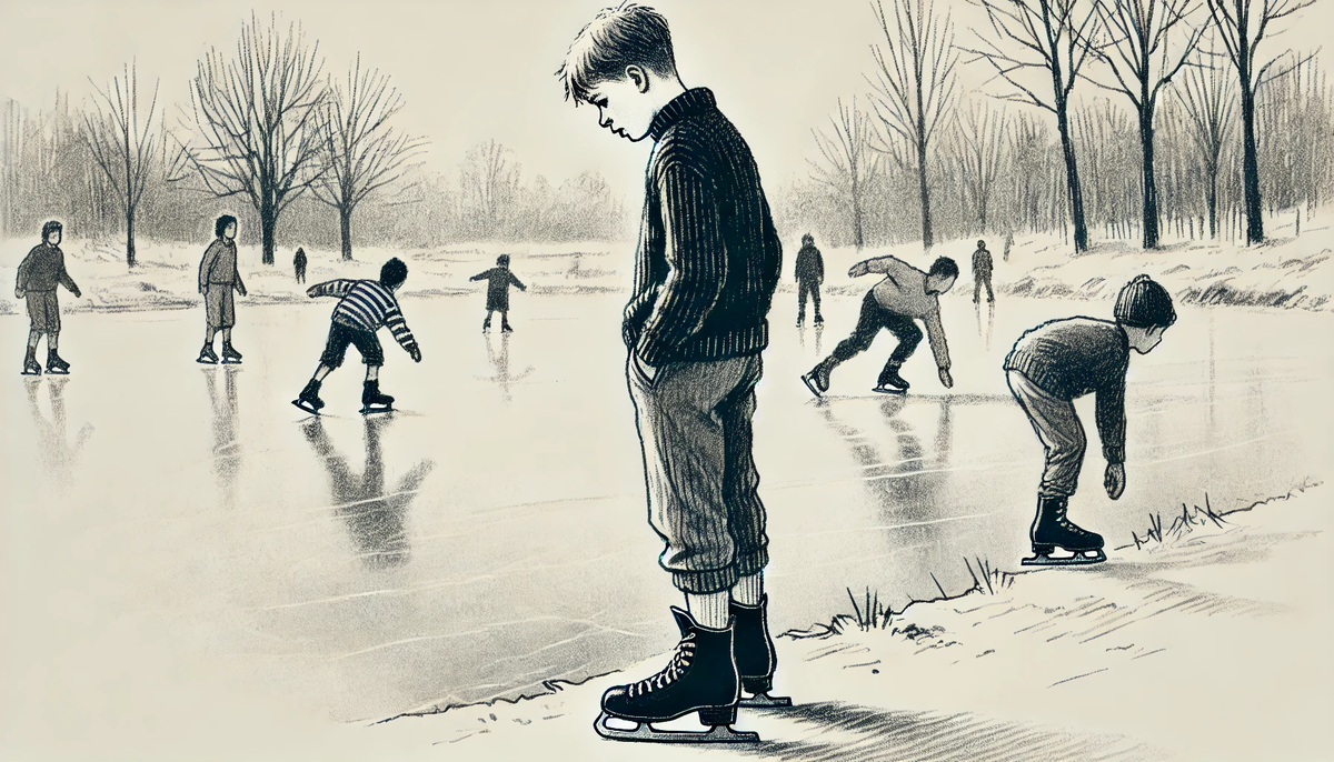 На пруду было шумно. Его одноклассники катались, смеялись, устраивали гонки. Андрей остановился у берега, присел на скамейку и начал зашнуровывать коньки. Это оказалось сложнее, чем он ожидал: пальцы замёрзли, а шнурки упрямо не хотели затягиваться ровно.