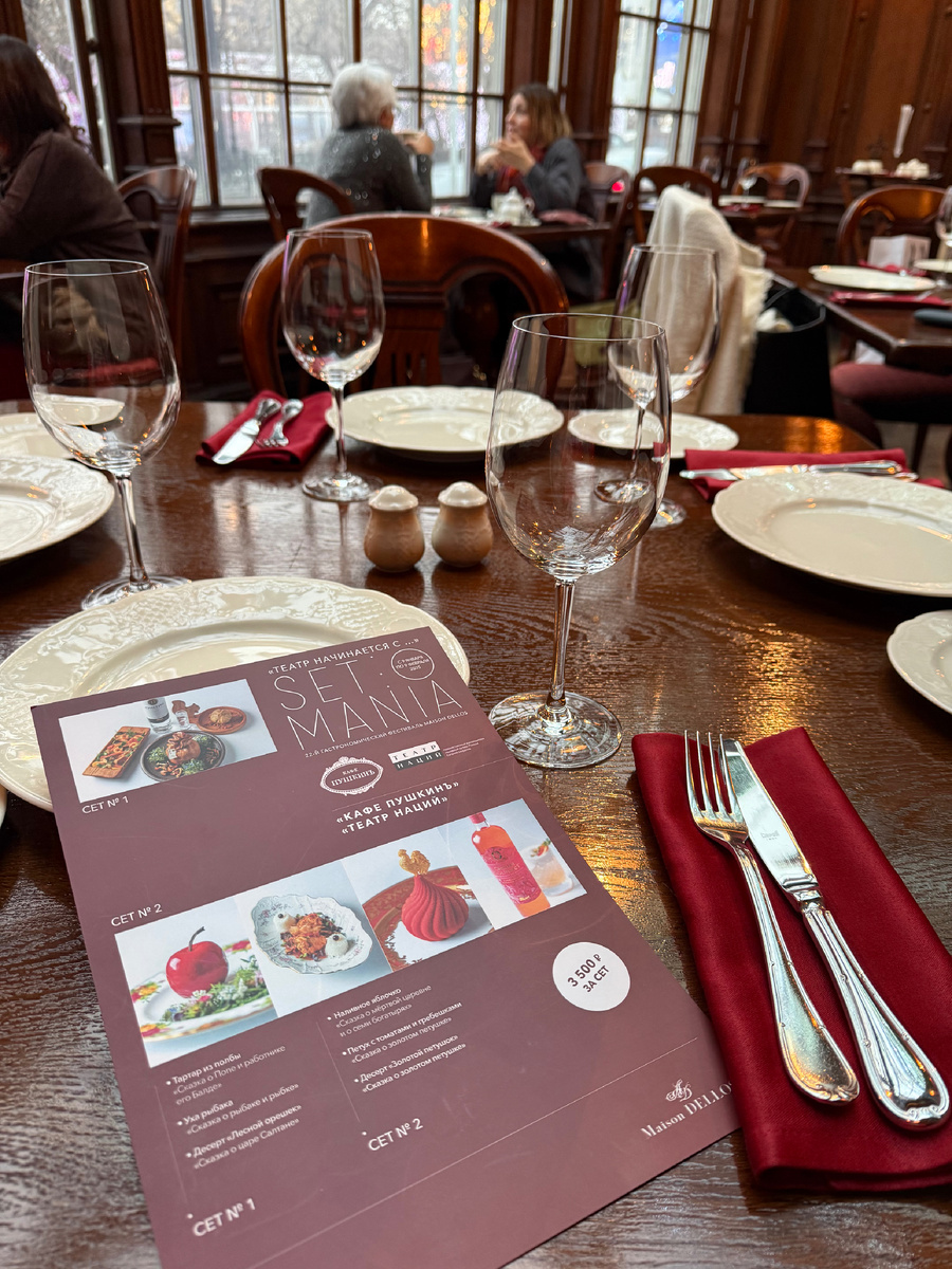 22-й Гастрономический фестиваль #SetOMania в ресторанах Maison Dellos стартовал! И будет проходить с 9 января до 9 февраля! Каждый год новая тема. 🎭В этом году «театры»! ✨Второй ресторан, куда мы дошли попробовать сеты - кафе «Пушкин». Он объединился с театром Наций. Сет №1 : — Тартар из полбы «Сказка о Попе и работнике его балде»; — Уха рыбака «Сказка о рыбаке и рыбке»; — Десерт «Лесной орешек» «Сказка о царе Салтане». Сет №2 : — Наливное яблочко «Сказка о мертвой царевне и семи богатырях»; — Петух с томатами и гребешками «Сказка о золотом петушке»; — Десерт «Золотой петушок» «Сказка о золотом петушке». Признаюсь, сеты здесь понравились очень! И в хорошем смысле слова удивили. Классная, вкусная русская кухня в современном прочтении. Тар-тар из полбы вообще диво дивное! Ну и, конечно, потрясающие десерты: белочка и золотой петушок, это прям из детства! 🎁Традиционно, попробовав минимум по одному сету в каждом из ресторанов можно принять участие в финальном розыгрыше