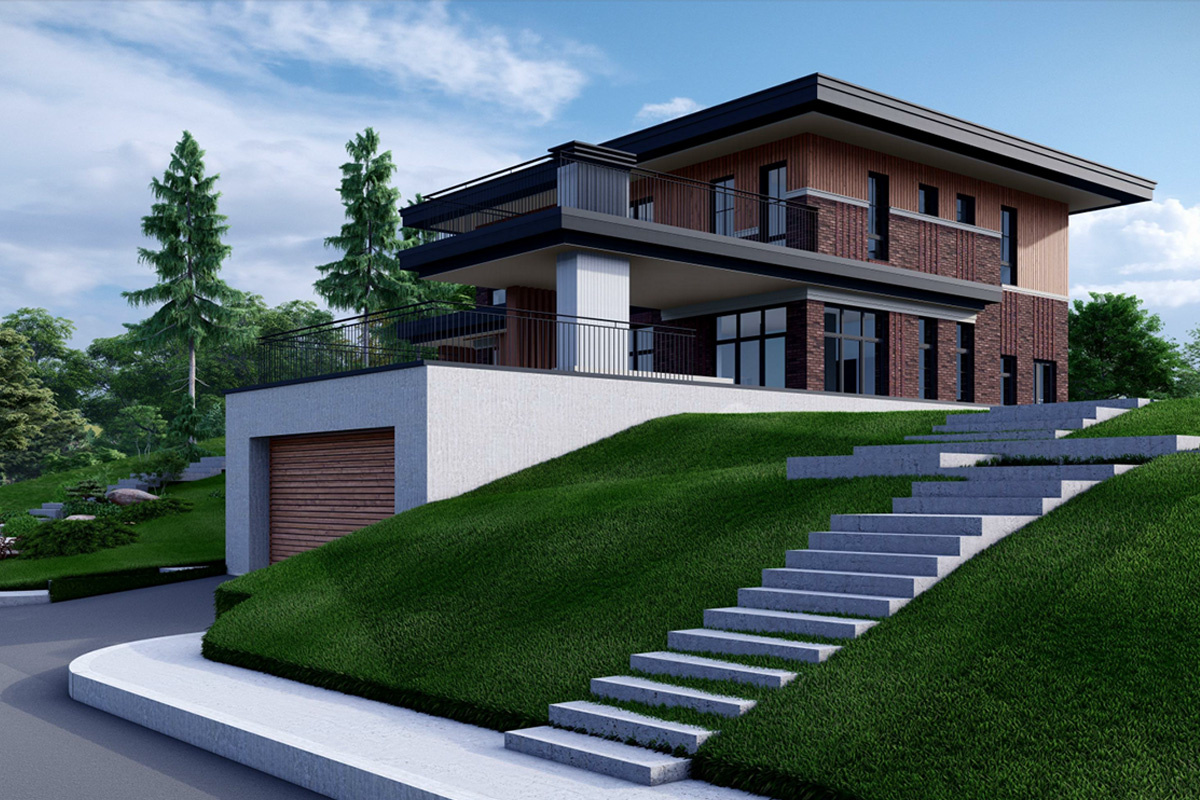 Добрый день! Мы завершили разработку архитектурной концепции совместно с нашими партнерами — командой ИП Аршинова А.В. Новый комплекс из семи участков будет расположен на склоне, что потребовало значительных усилий, чтобы не только создать дом, но и сразу спланировать окружающее его пространство.