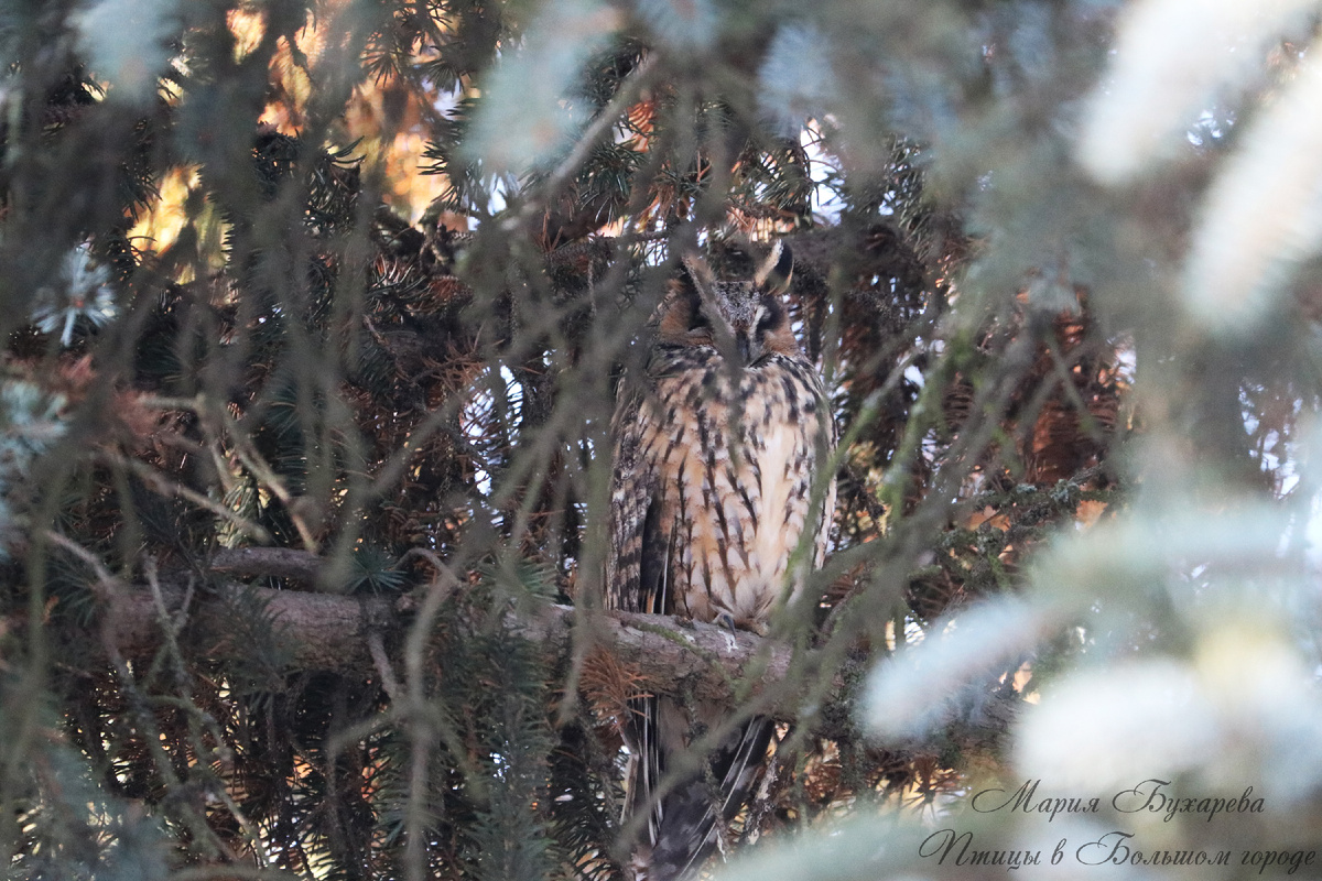 В этой рубрике я рассказываю об обстоятельствах встречи с той или иной птицей и могу кратко поделиться информацией о виде в целом. Сегодня был приятный солнечный день, и я вышла ненадолго в Южно-Приморский парк. В этот раз, впервые за зиму, мне улыбнулась здесь удача, и я наконец-то нашла там ушастую сову. Не скажу, что бывала здесь в последнее время регулярно, но с ноября несколько раз заходила, и каждый раз совы меня своим присутствием не радовали: или отдыхали в других местах, или просто так хорошо прятались, что их не удавалось найти. Ушастая сова включена в Красную книгу Санкт-Петербурга. Является перелётным видом. Cмело можно говорить, что единичные особи зимуют в городе регулярно! Согласно базе данных GBIF, ушастых сов в черте Петербурга отмечают с 2014 года каждую зиму. В определителе Рябицева по птицам ЕЧР сказано, что в ряде крупных городов есть оседлые популяции, так что наверняка и наших петербургских зимовщиц можно отнести к их числу. В основном в холодный сезон птиц вст