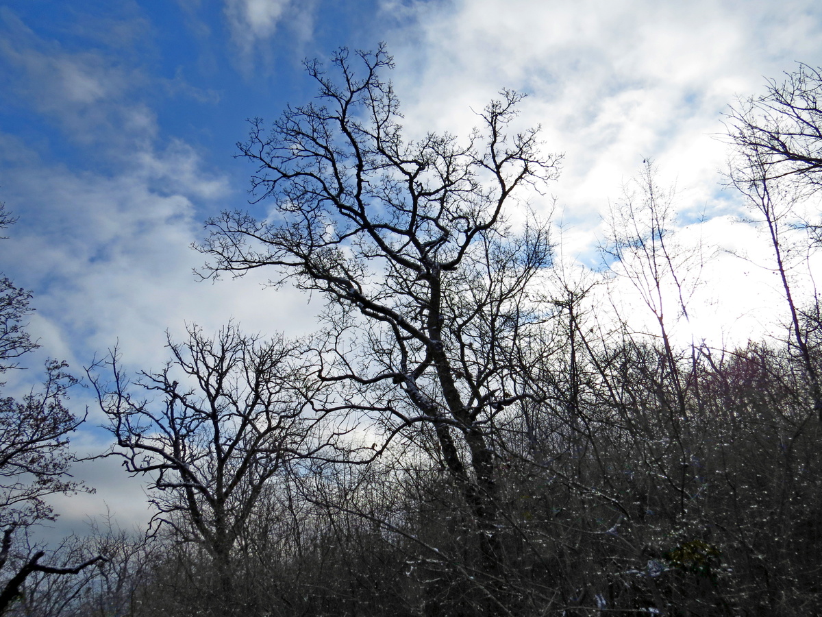 Получилась у меня неожиданная прогулка в лес. Основная цель прогулки необычная и совсем другая. Но, ведь искать подснежники не запрещается! даже если всего 15 января. День был слегка морозный. Вершины гор присыпаны снежком. Над урочищем зависла огромная и низкая серость. На всех веточках поблескивали замерзшие капельки. То ли это вчера таял снег. То ли это густой туман осел на веточки и превратился в хрусталь. Вокруг нас кружат крикливые сойки. Из-за деревьев наблюдают за нами огромные скалы. все вокруг кажется таинственным. Взгляд зацепился за яркую небольшую полянку, покрытую мелкими красными листиками. Осень? Зима? Весна? Все сразу! На другой стороне полянки красовался шикарный куст ломоноса. На свои пушистые , уже отцветшие соцветия, он кокетливо надел шапочки из снега. Нежно и романтично! Пора бы присмотреться к прошлогодней листве, а вдруг там выглянет подснежник! И чудо! Они есть! Пока еще только маленькие и несмелые зеленые стрелочки, смотрящие в небо своими беленькими нако