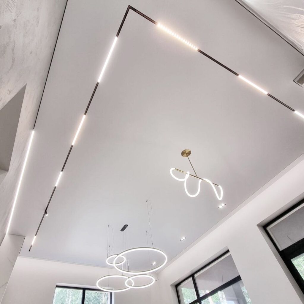 - В зависимости от стиля помещения, можно заказать разные виды потолков: парящие потолки для современных интерьеров или классические варианты.