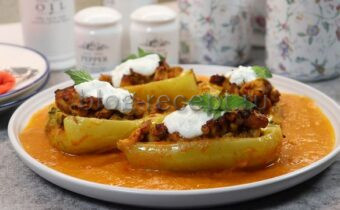 При подаче я наливаю сначала на блюдо соус из формы для запекания, затем сверху раскладываю перцы, а на курицу обязательно еще по ложечке йогурта. Подавать такие перцы лучше всего с простым отварным рисом. И это очень вкусно.