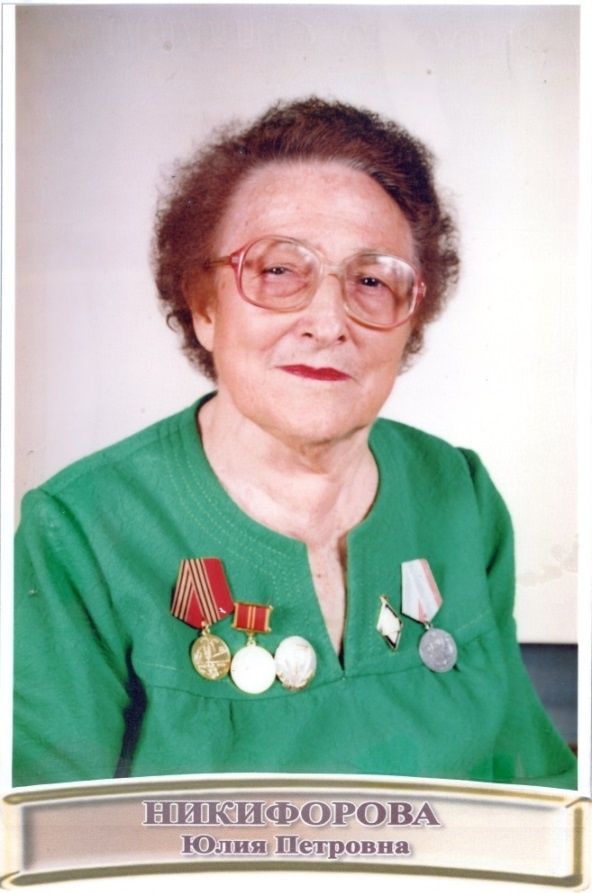 Свой трудовой стаж ветеран педагогического труда, бывший директор школы №1 Юлия Петровна Никифорова начала в рабочем поселке Чернышковском учителем географии, затем стала заместителем, а в 1956-м году директором школы. В 1965-м году Юлия Петровна была переведена в Суровикинскую школу №1, где сначала работала завучем, а затем директором. Суровикино стал ей родным городом. Всю свою жизнь она посвятила народному образованию. Высокий профессионализм, глубокие энциклопедические знания Юлии Петровны, огромное уважение к людям, непревзойденный авторитет среди коллег, учителей и родителей делали школу №1 лучшей в городе и районе. Требовательность, принципиальность, любовь к детям, стремление к новому, трудолюбие и добросовестность, энергичность и деловитость, умение рационально организовать свою работу, подчинить свою деятельность интересам дела – вот главные принципы ее педагогической деятельности. Юлия Петровна внедряла в жизнь лучшие традиции школы, на ее долю выпал переход ко всеобщему сре