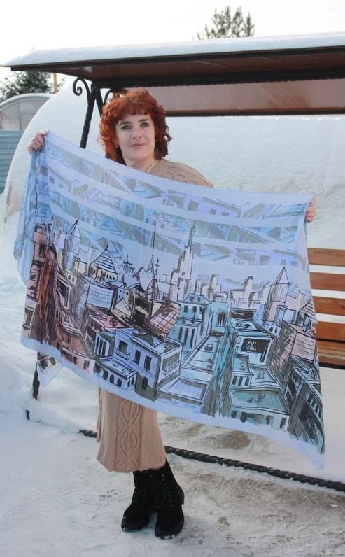 Традиционен для литературы образ романтичной героини, кутающей плечи в палантин. Я тоже люблю этот аксессуар в виде прямоугольной накидки. Недавно купила павлопосадский палантин из вискозы, чтобы дополнить вязаное платье. Это не просто шелковистый широкий шарф, это художественное произведение, изготовленное на Павловопосадской платочной мануфактуре. На нём художник Маканчук Инна изобразила Петербург, где я хотела бы побывать. Это современный облик города, соединяющий исторические постройки с небоскрёбами, небо над которым расчерчено электрическими проводами. Цветовая гамма характеризуется плавным переходом от коричнево-серого к голубому и прекрасно подходит к связанному мной бежевому платью. Мне кажется, на нём запечатлена панорама города на Неве в лучах восходящего солнца, окрашивающего кварталы в нежные оттенки жёлтого, розового, зелёного и голубого. Голубой подходит к моим глазам, отражаясь в них, придаёт им яркость. На этом снимке в нижнем углу палантина мы видим небольшое ромбовид