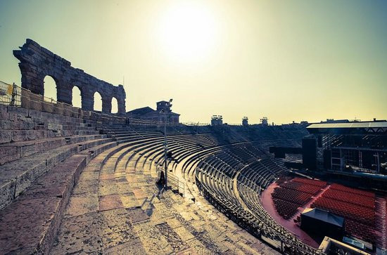 Благо веронские арены — одно из наилушим образом сохранившихся сооружений подобного типа. Построенный к тридцатому году от Рождества Христова (в эпоху между царствованием Августа и правлением Клавдия), облицованный в годы молодости белым и розовым известняком, амфитеатр был рассчитан на более чем 30 тысяч зрителей. Сегодня их на треть меньше, но все равно это самая большая действующая античная сцена, предлагающая в среднем по 50 представлений в сезон. Основные зрительские места расположены на трибунах, где стоят дешевле, чем кресла в партере.