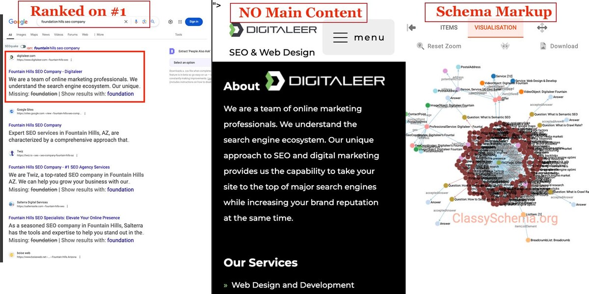 Мой ответ – нет! 🚫 Дэнни Салливан уже публично разъяснил это. Но прежде чем недооценивать ее важность, выслушайте меня: «Схема по-прежнему имеет большое значение!» Хотя микроразметка не является прямым фактором ранжирования, она играет ключевую роль, помогая роботу Googlebot лучше понимать ваш контент с помощью структурированных данных. И сайты, использующие микроразметку Schema.org, часто замечают улучшение позиций в поисковой выдаче с течением времени. Почему так? 🤔 Потому что схема улучшает видимость в поиске, рейтинг кликов и вовлеченность пользователей, что косвенно влияет на ранжирование. Давайте рассмотрим пример из реальной жизни: Недавно Digitaleer занял #1 место в поисковой выдаче по локальным ключевым словам с помощью Schema Markup, но не так, как вы могли бы подумать. Удивительно то, что на этой странице нет никакого значимого контента, который мог бы служить намерениям пользователя. Так как же им это удалось? С помощью черной практики SEO, называемой клоакингом, структур