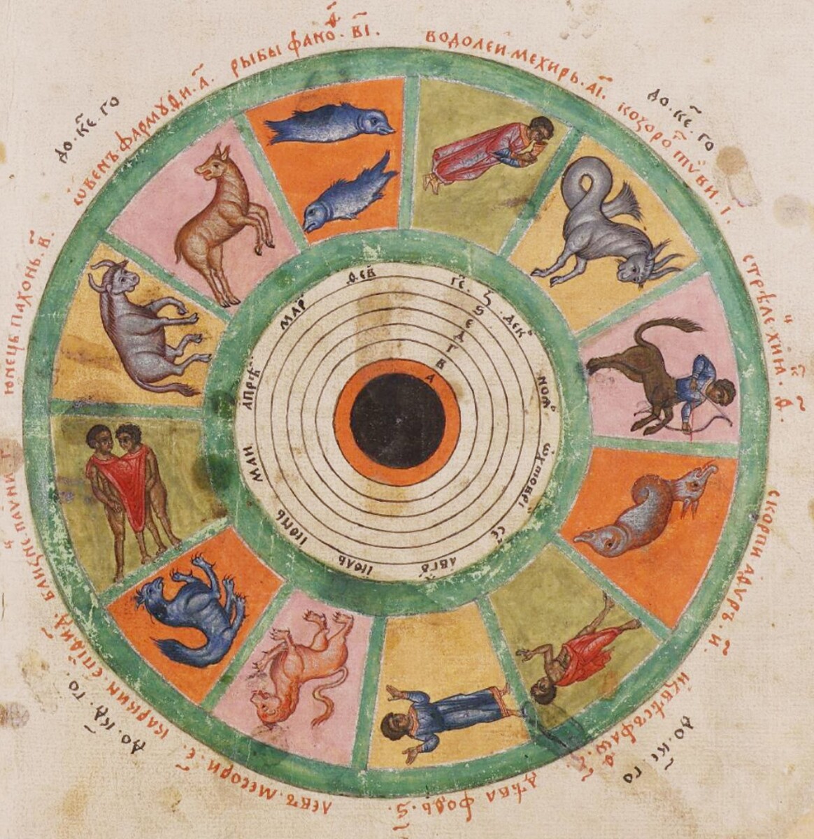 Затем идут Лев и Дева, весьма похожие на льва и деву, а потом снова сюрприз. Вместо Весов изображен человек в красной тунике, подписанный как Извесъ. Он что-то держит в руке, но разобрать трудно. Возможно, это и есть миниатюрные весы, а подпись можно перевести на современный язык как весовщик. Скорпион изображен тоже весьма нетипично: существо о двух головах с одним сросшимся телом змеи или рыбы. Надпись – скорпи. Стрелец довольно обычен – изображает кентавра, а Козерог имеет только передние ноги, задняя часть представляет что-то типа рыбьего хвоста.
