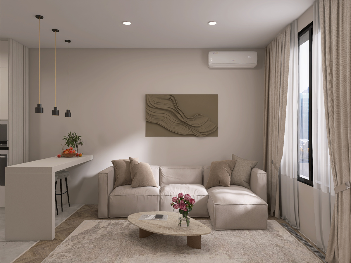 Молодая пара с ребенком приобрели двухкомнатную квартиру площадью 63,14 м2, главными запросами по дизайну были отдельная комната ребенку, совмещенная кухня-гостиная и мастер-спальня. Изначально план помещения выглядел так: Для создания комфорта всем членам семьи я предложила следующую планировкусо всеми пожеланиями: Из пожеланий по стилю и цветовой палитре – современный стиль, бежевые оттенки. Начнем с прихожей, которую заказчики хотели максимально полезно использовать. В решении этой задачи помог встроенный гардеробный шкаф до потолка в цвет стен. Далее перемещаемся в кухню-гостиную. Кухонный гарнитур включает в себя модули с духовым шкафом, электрической панелью, мойкой и посудомоечной машинкой. Также здесь разместился встроенный холодильник и обеденная зона. За счет светлых тонов кухню-гостиную удалось сделать визуальног просторной и стильной. Спальня родителей с комодом и шкафом для хранения вещей. Также, я решила сделать для молодой пары "собственный санузел", который расположе