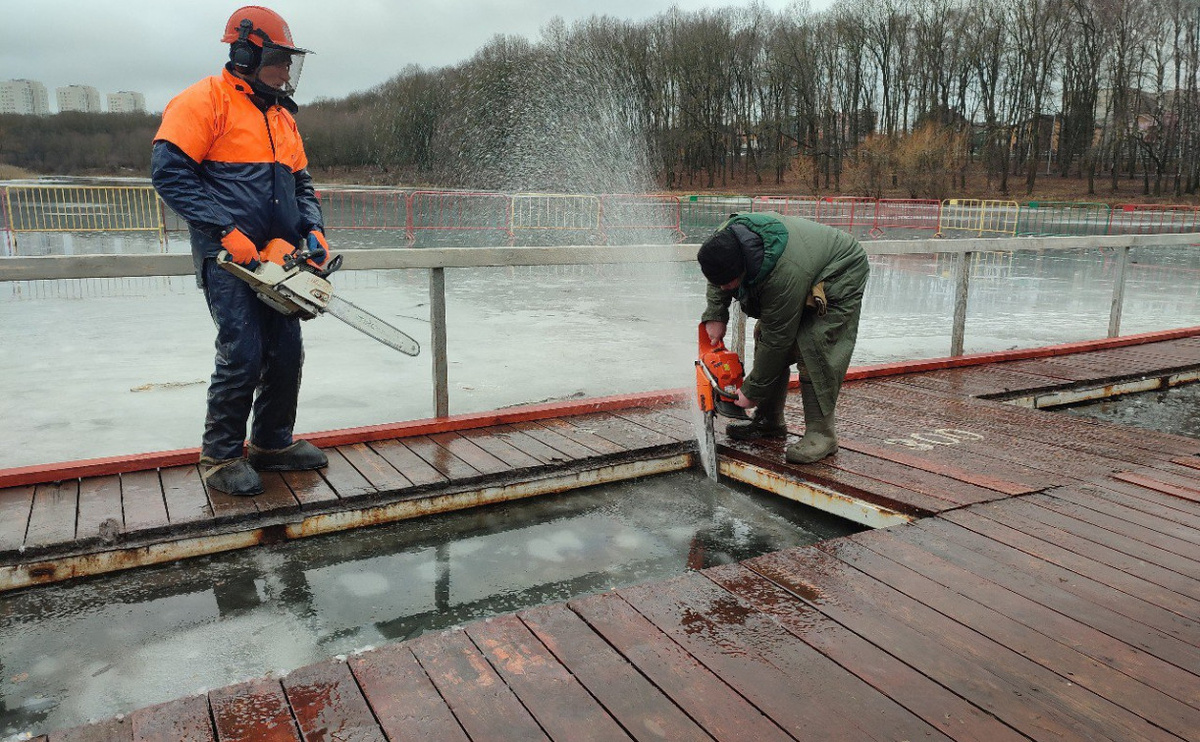 Купели ежегодно открываются в технологических отверстиях деревянного настила плотины: специалисты снимают специальные щиты, открывая «проруби», и ставят сходни. Остатки льда в отверстиях убирают. Сейчас подготовка к крещенским купаниям в ЦПКиО в самом разгаре.