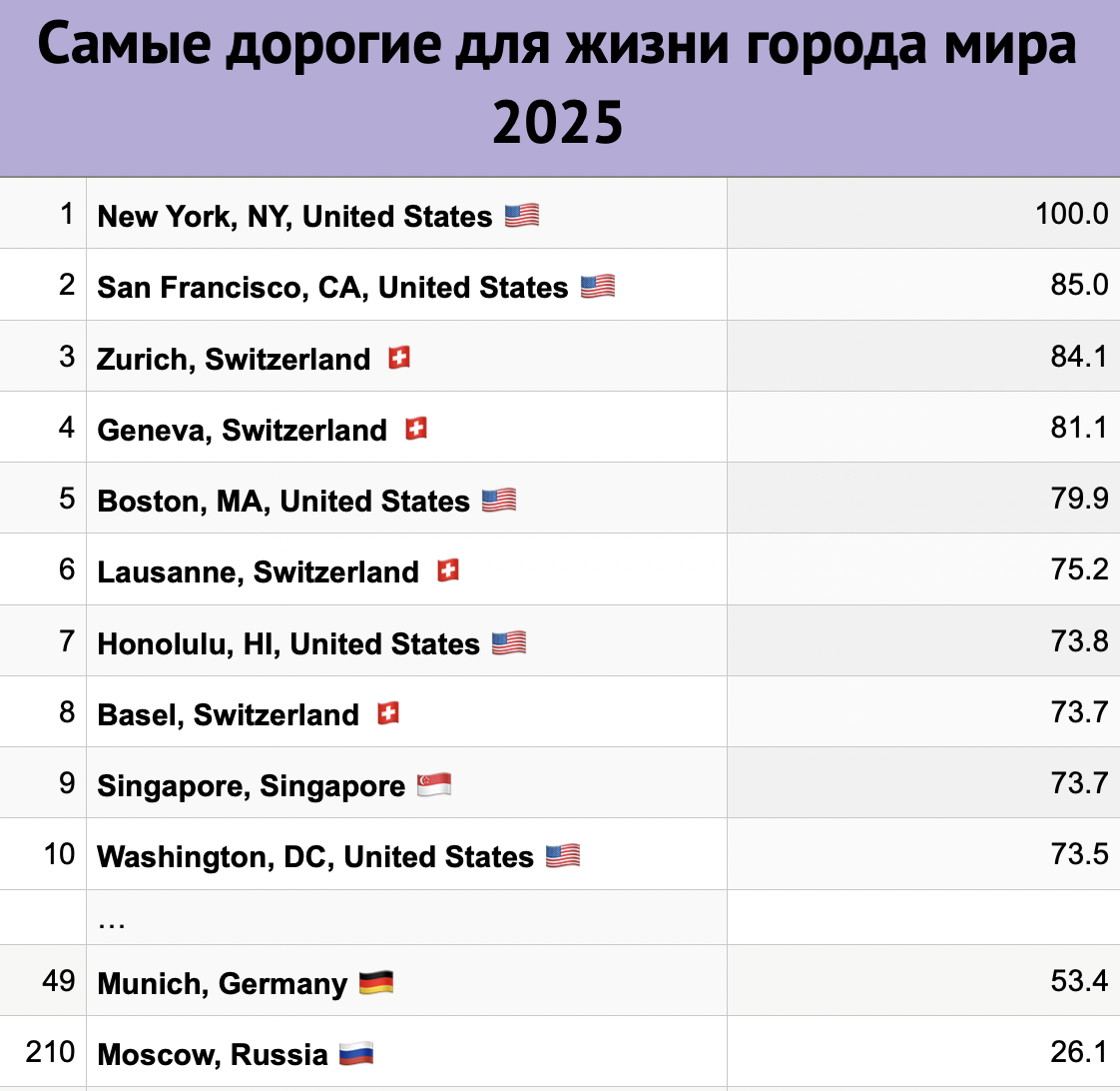 Сербская компания Numbeo опубликовала рейтинг стоимости жизни на начало 2025 года. Данные рассчитываются относительно цен в Нью-Йорке (индекс Нью-Йорка - 100%). Топ самых дорогих городов мира, учитывая стоимость аренды, вы видите на картинке. Полный список здесь. Канал Культурион в Телеграмм - подписаться Самые дорогие города Европы 🇪🇺 4 города Швейцарии находятся в топ-5. Помня про уровень местных зарплат, предлагаю за швейцарцев не переживать. Сложнее, как мне кажется, жителям Лондона (4ое место в рейтинге), где зарплаты сравнимы с немецкими, а цены заметно выше. Топ-10: 1. Цюрих (84.1) 2. Женева (81.1) 3. Лозанна (75.2) 4. Базель (73.7) 5. Лондон (72.6) 6. Берн (67.6) 7. Рейкьявик (66.1) 8. Амстердам (59.7) 9. Дублин (58.7) 10. Копенгаген (57.3) Замыкают список российские города Уфа и Пермь. Самые дорогие города Германии 🇩🇪 Германия в этом рейтинге держится достаточно скромно. Мюнхен занял 16-е место, сильно опередив других соотечественников. Любопытно, что Франкфурт (29 место)