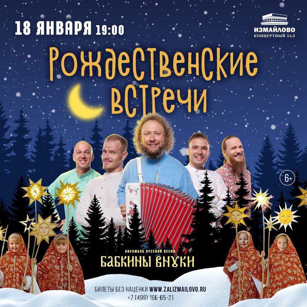 Приглашаем всех на праздничный концерт ансамбля русской песни "Бабкины внуки" "Рождественские встречи" Москва 18 января, 19.00 Концертный зал "Измайлово" Друзья, приходите, споëм для вас прекрасные песни, вместе отдохнëм Душой! После концерта всех желающих будут ждать наши тëплые рукопожатия и совместные фото! https://tickets.afisha.ru/wl/183/api#/place/887404