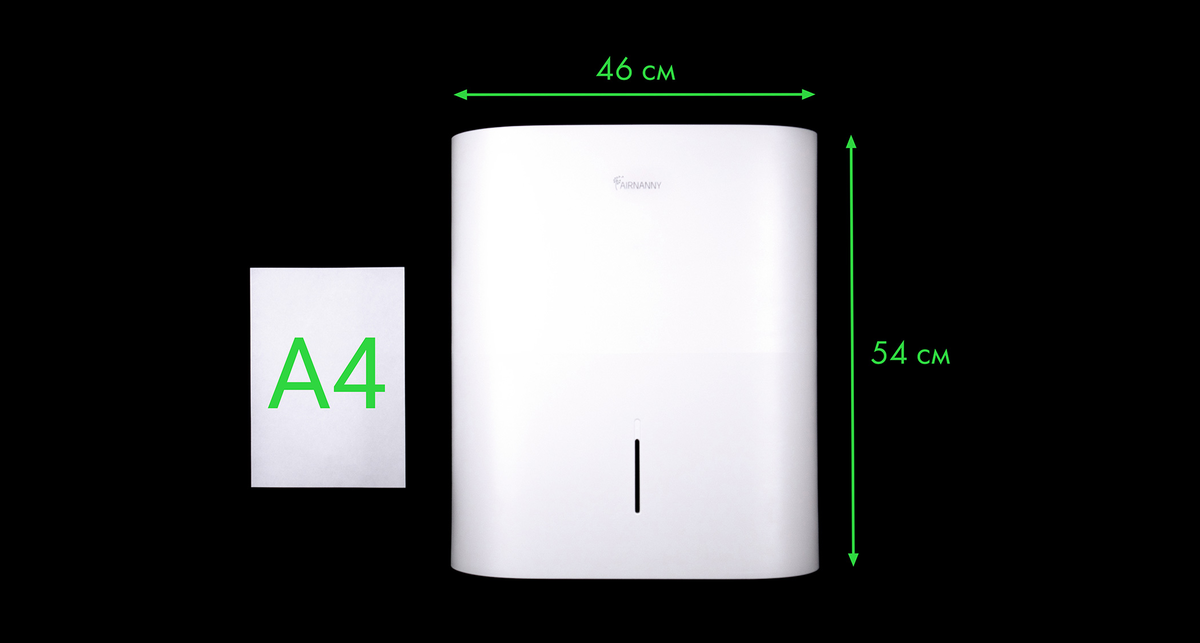 Размеры бризера AIRNANNY A7: высота — 54 см, ширина — 46 см, глубина — 20 см. Площадь, занимаемая корпусом, — не более четырёх листов бумаги формата А4, сложенных рядом.